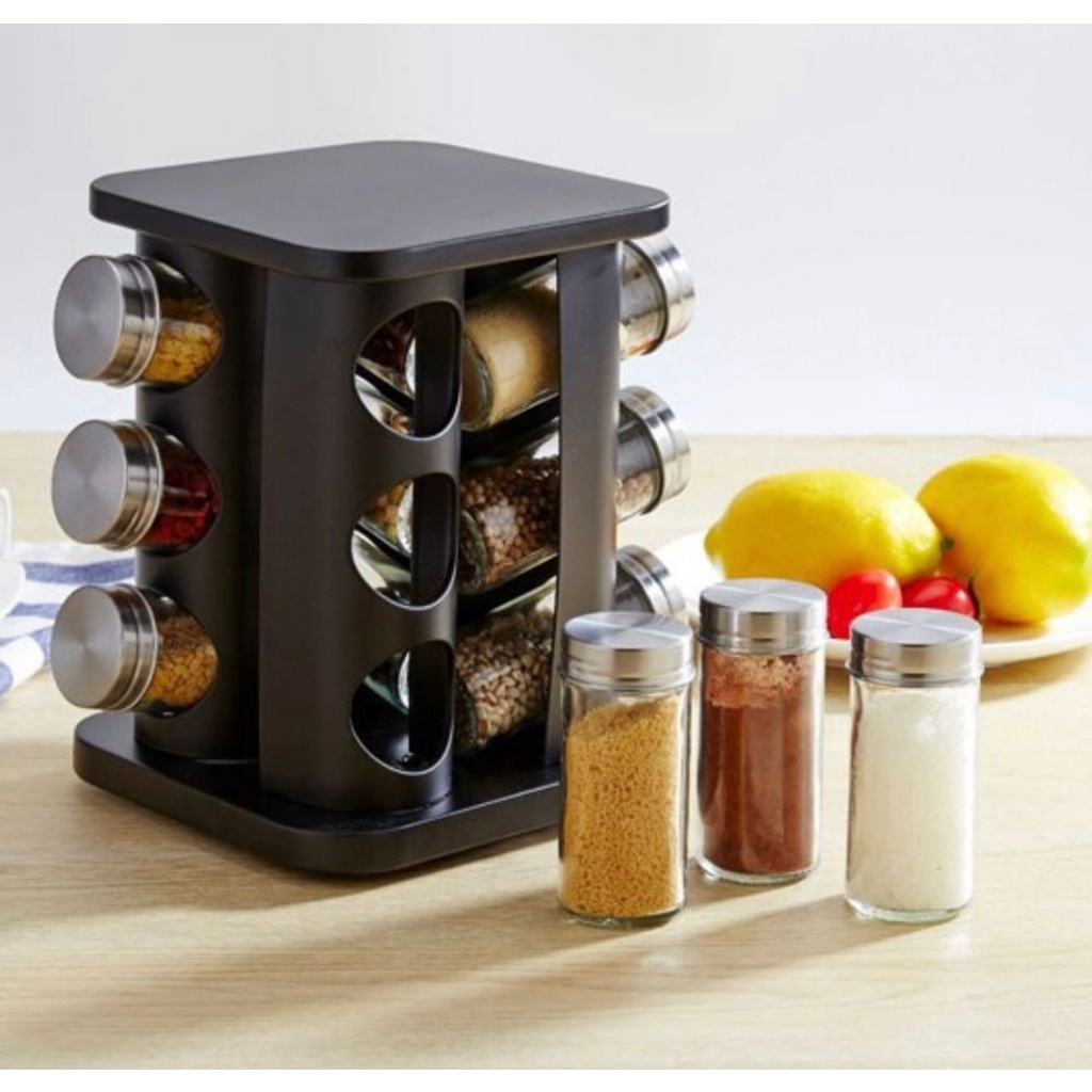 Porta Condimentos Giratório Cozinha Tampa Dosadora Temperos Moderno Inox Preto Com 12 Potes 80ml Suporte Redondo Quadrado Premium