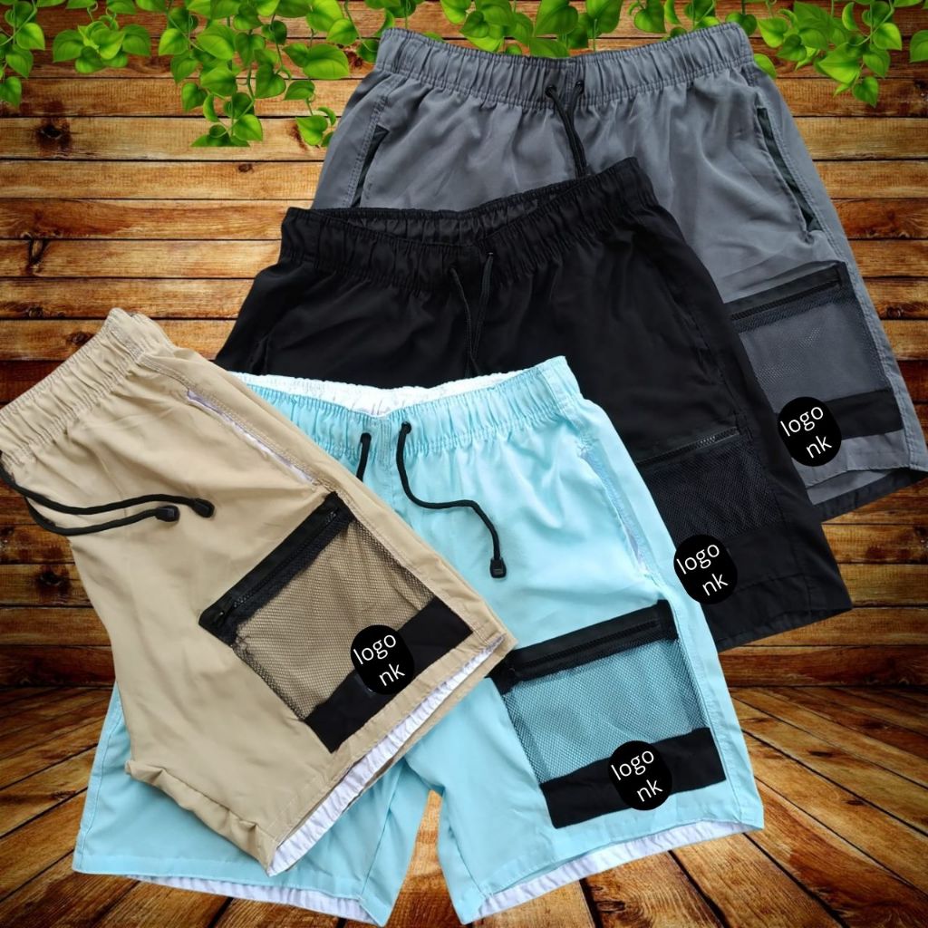 kit com 4 Bermudas cargo 3 bolsos Tactel com elastano bolso de telinha com zíper