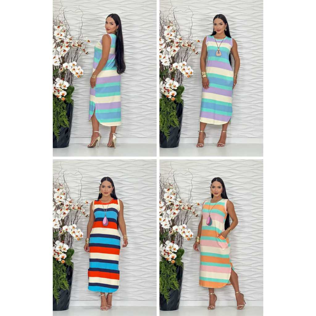 vestido Feminino regata, com gola e fenda na lateral, no tecido visco lycra, listrado.