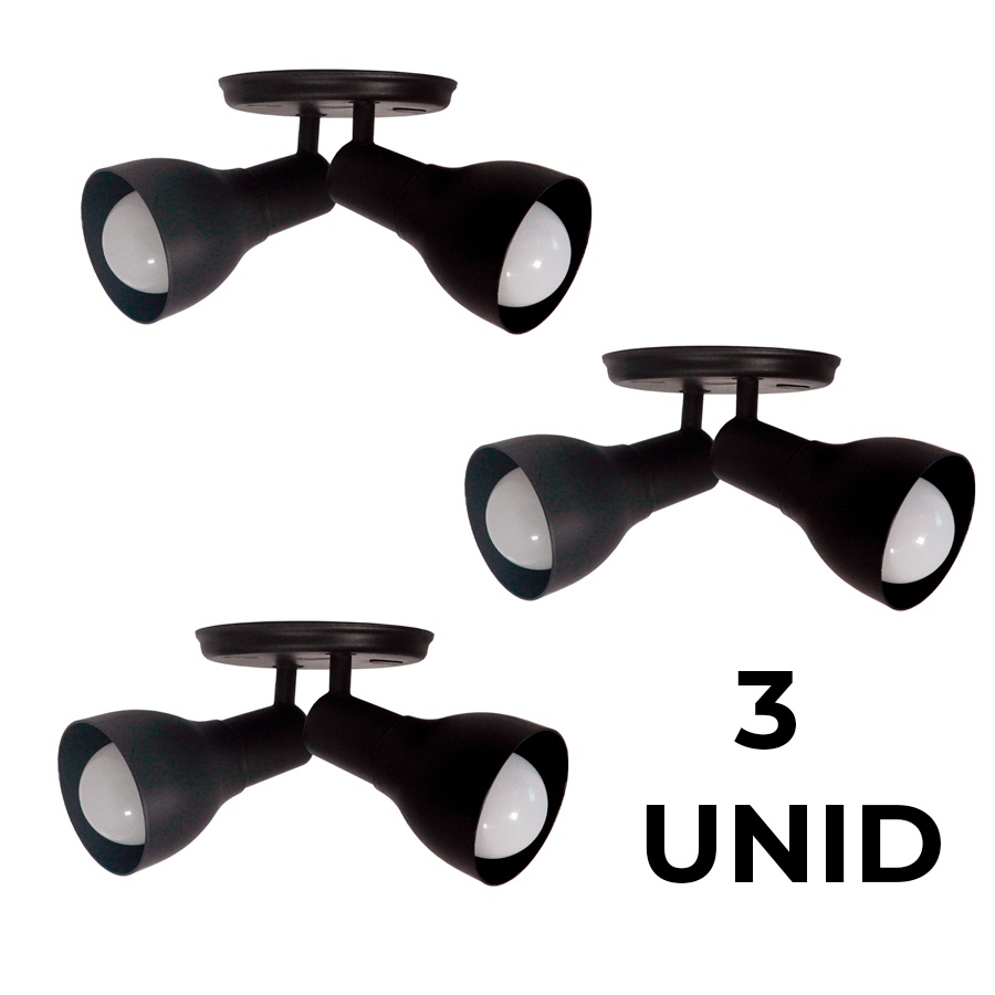 Kit 3 Luminárias Spot de Sobrepor Duplo 2 Lâmpadas E-27 Preto