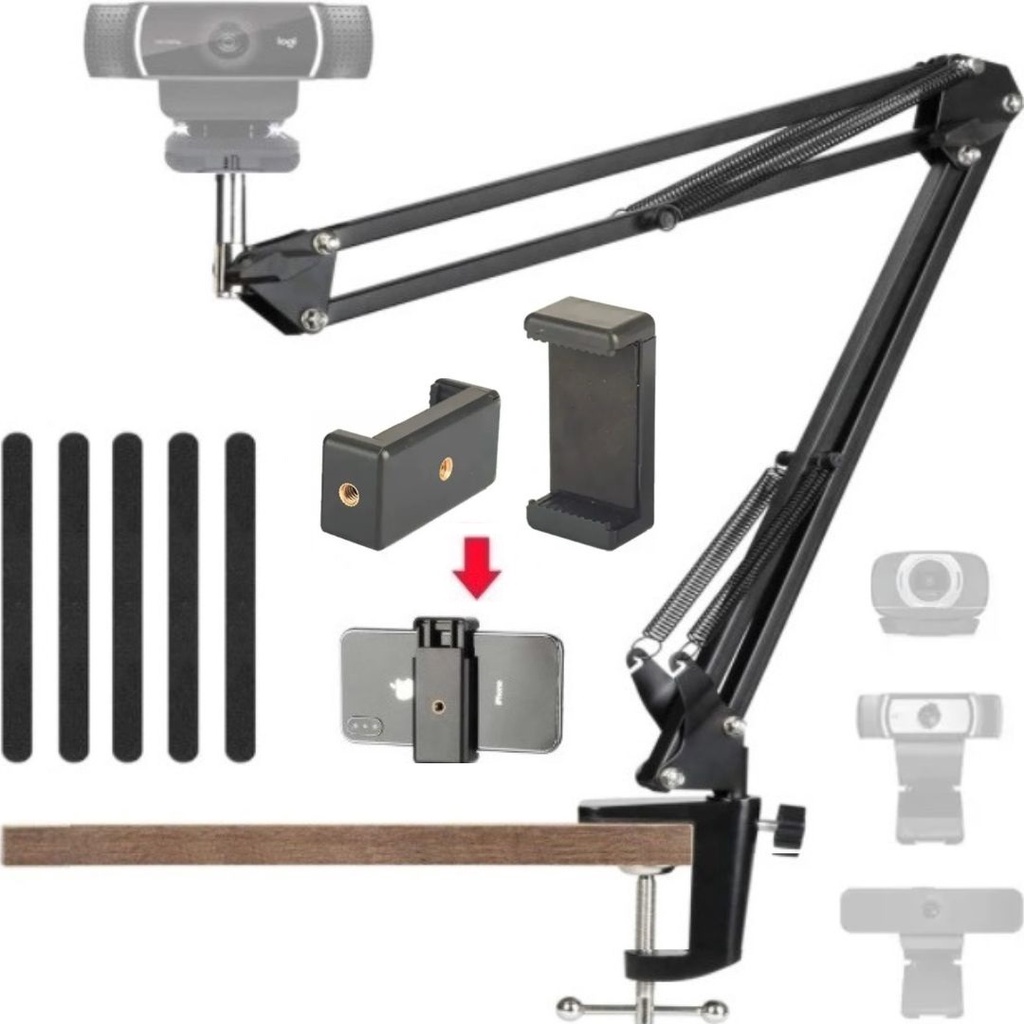 Suporte Braço articulado de mesa para webcam luz estúdio bancada escritório