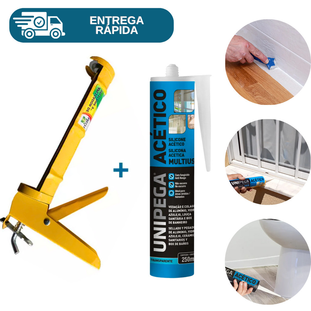 Kit Silicone Cola Multiuso Acético Incolor + Pistola Aplicador De Silicone Selante Vedação Pia Box