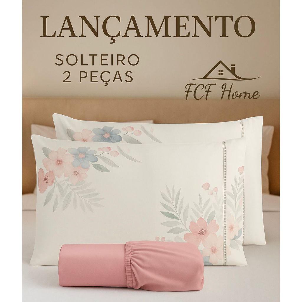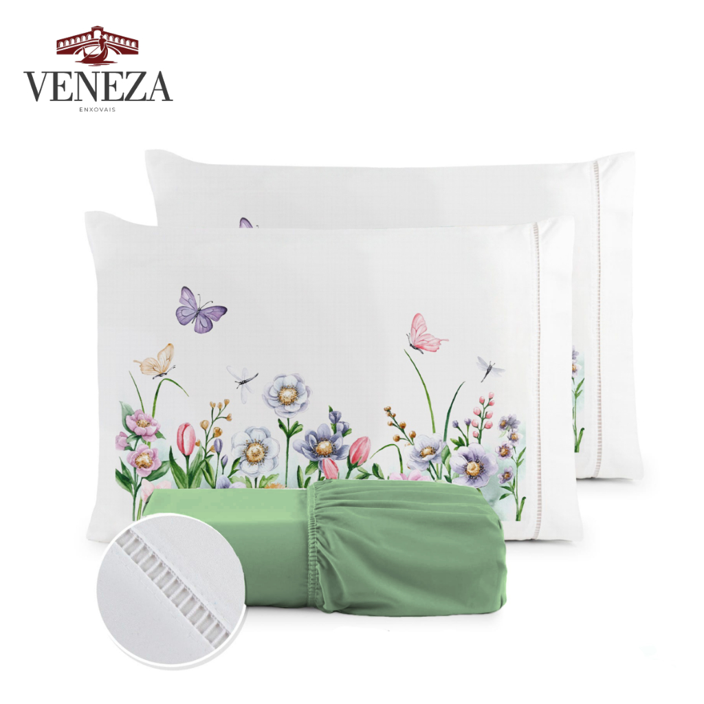 Kit Jogo de Lençol Micropercal 400 FIOS - Compouse Fronha Estampa Floral Ponto Palito + Lençol Cores