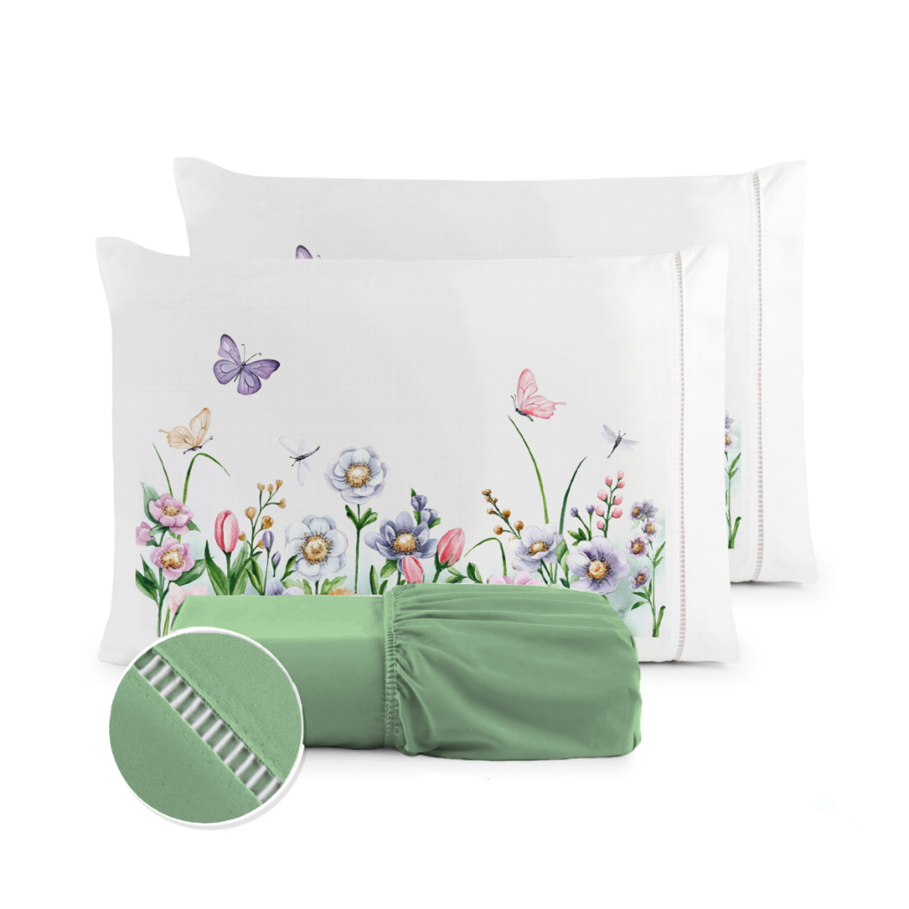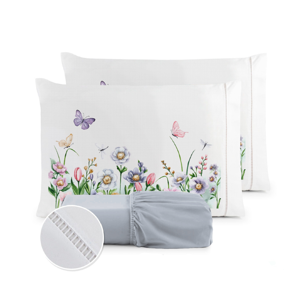Kit Jogo de Lençol Solteiro Fronha Estampada Micropercal 400 Fios Ponto Palito - Borboletas