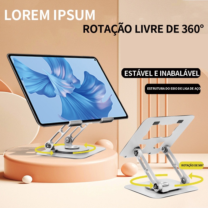 Suporte Giratório 360° De Alumínio P/ Tablet Ate 12 Polegada' é um suporte dobrável e rotativo para tablets