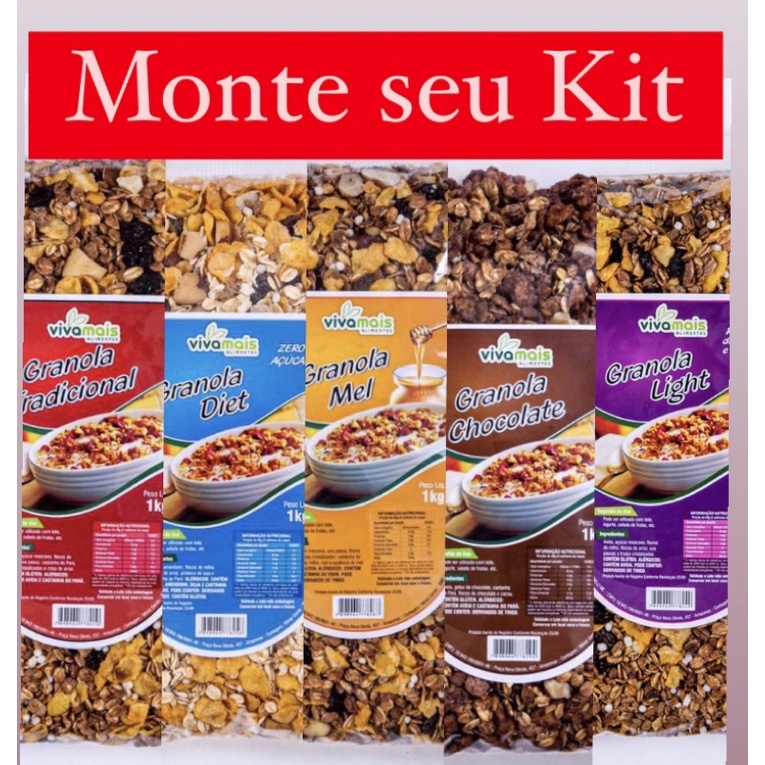 Monte seu Kit de Granola 1kg ( Tradicional ,Diet ,Light, Mel, Chocolate)