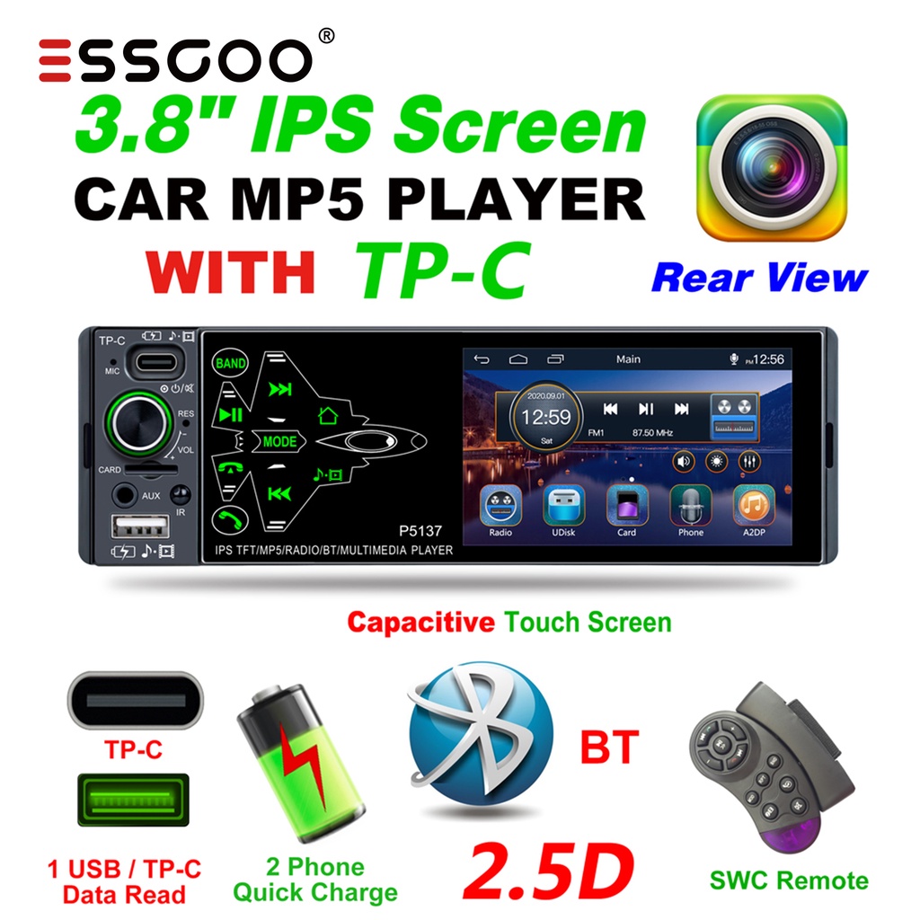 ESSGOO 3.8” 2.5D HD Touch Screen Bluetooth Estéreo Carro Rádio 1DIN MP5 Player USB/Interface TP-C Com Câmara De Marcha