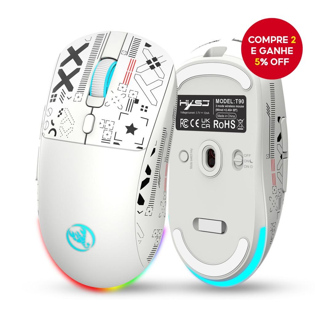 Mouse Gamer Sem Fio, Recarregável, Iluminação RGB, Bluetooth, 2.4g - 3600dpi. HXSJ T90 BRANCO