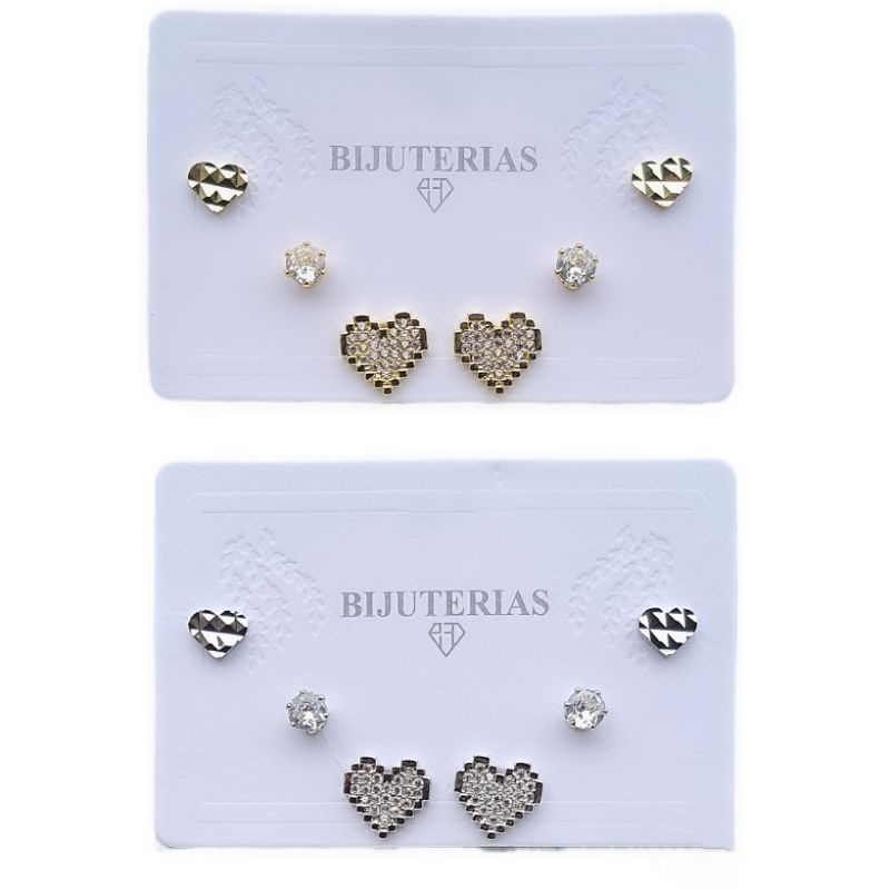 Trio de brincos coração cravejado e ponto de luz alto brilho