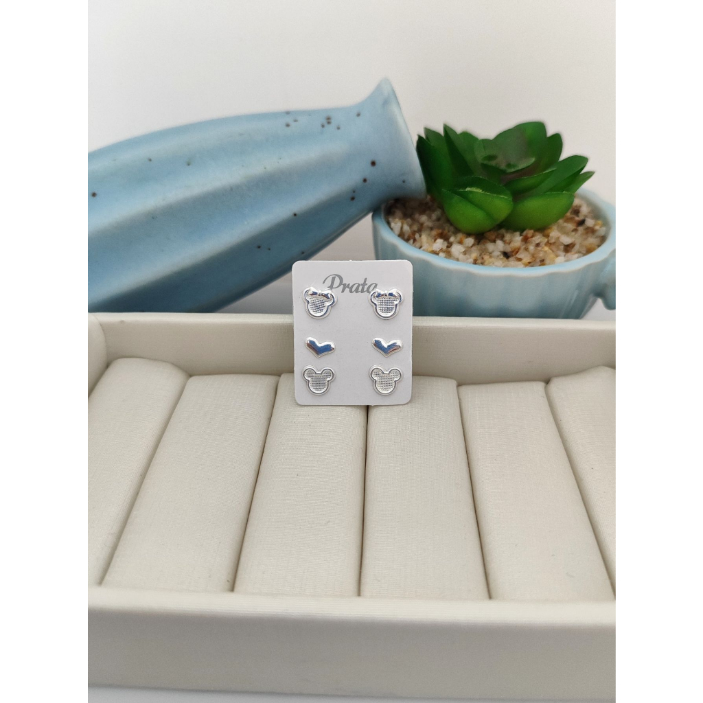 Trio de Brincos Prata 925 Original - Mini, Coração Liso e Mickey