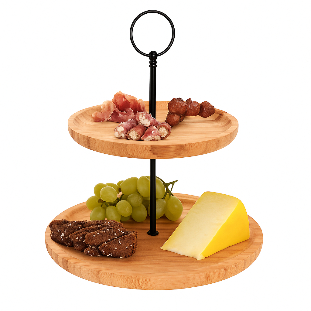 Suporte Porta Doces Petisqueira 2 Andares Bambu Organizador Bandeja Torre Prateleira Petisco Cupcake