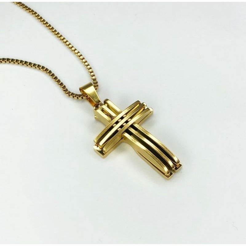 Colar Corrente Dourado Masculina Aço Inox Com Pingente Cruz Crucifixo Vazada 3D