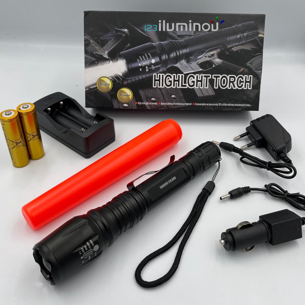 Lanterna T6 16500w 460000 Lumens Militar Zoom Recarregável LED 20cm Com Duas Baterias Com Carregador A Prova Dagua