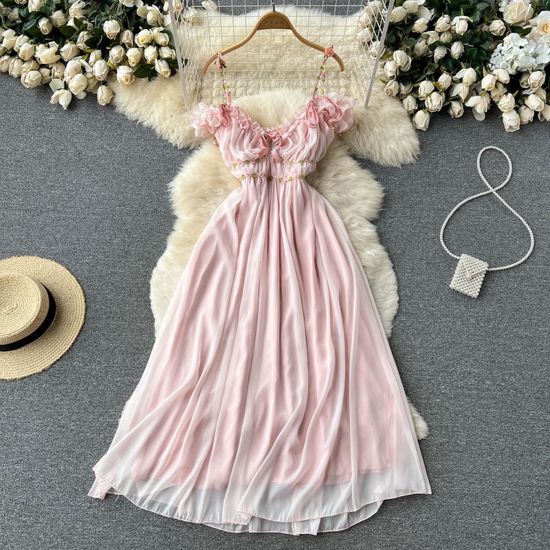 Vestido Feminino Com Babados/De Chiffon/Ombro Vazado/Sexy/Rosa Para Festa/Noite