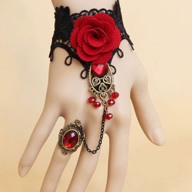 Elegante Pulseira De Renda Gótica Feminina Com Anel De Dedo Ajustável