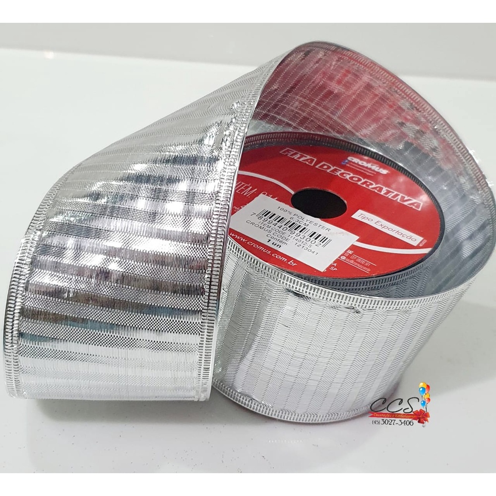 Fita Aramada Metalizada Prata 6,3cm x 9,14cm - Fitas Natalinas - Ref 1213041 Cromus Natal