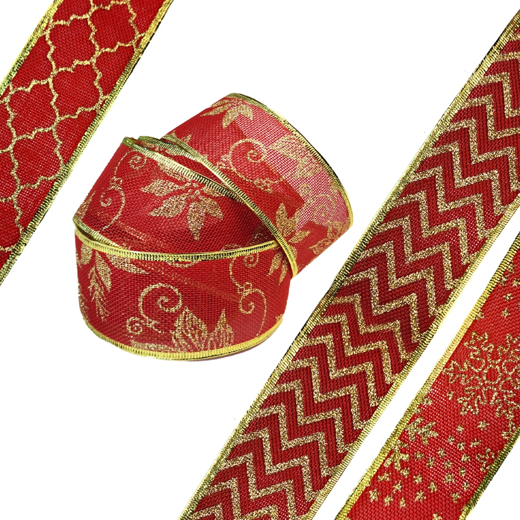 Fita Decorativa Grande Super Brilho 6,3cm x 9,15m Vermelha e Dourada com Gliter Borda Aramada Decoração de Natal | Laços | Enfeites