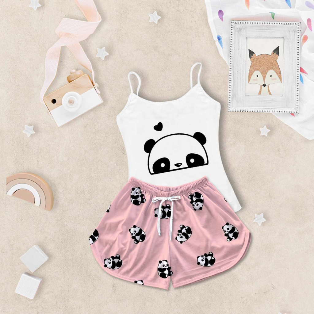 Pijama Infantil Feminino Baby Doll Camisa Alcinha Panda Rosa