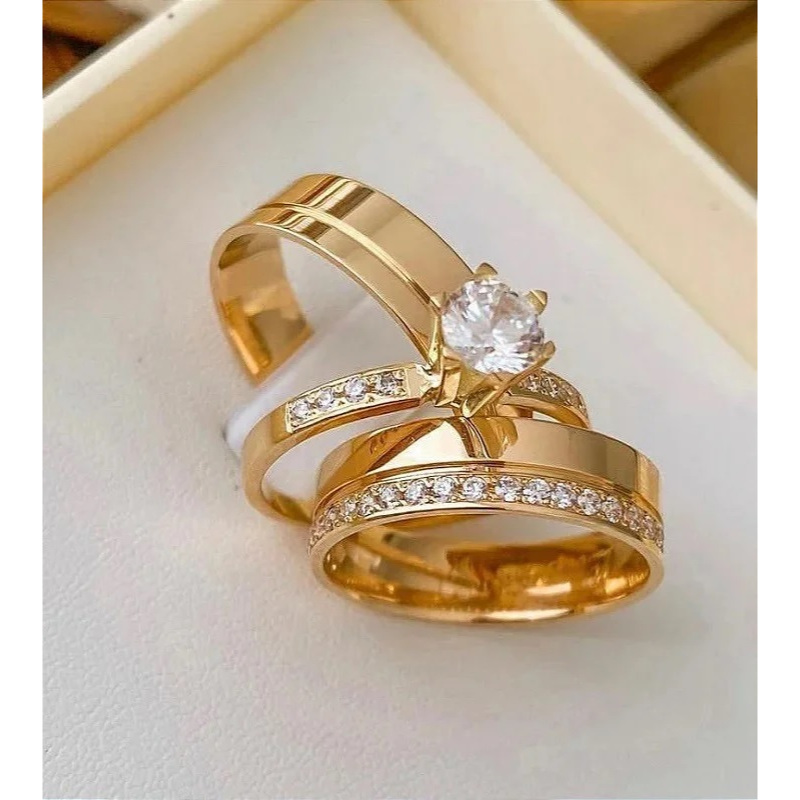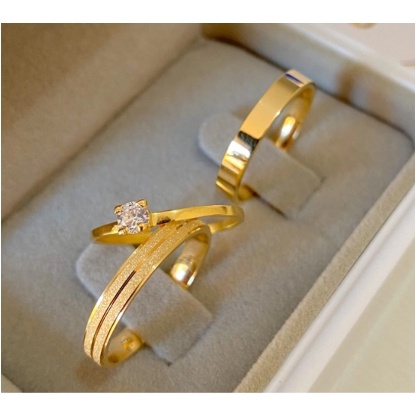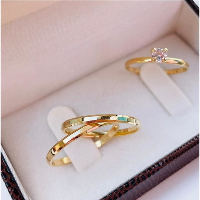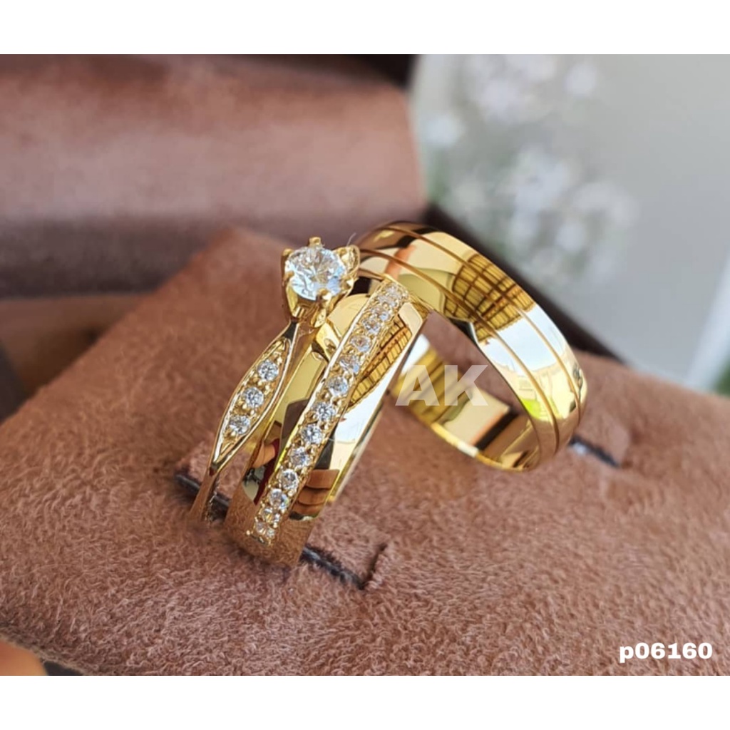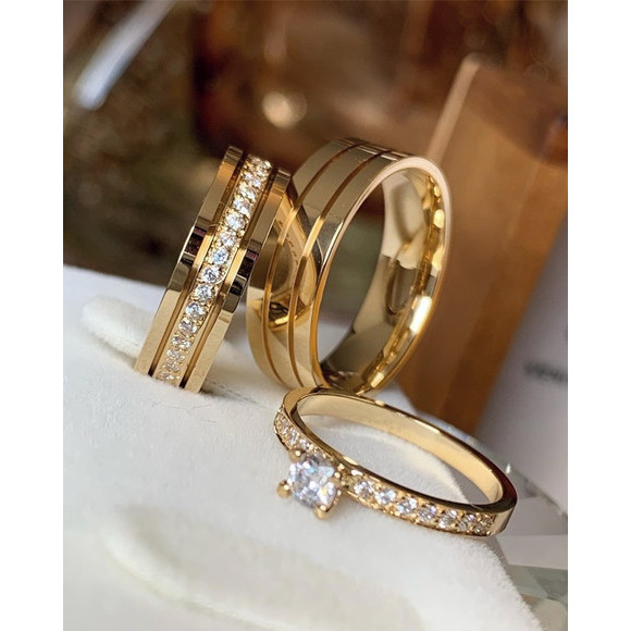 Par de Aliança compromisso Banho Moeda Antiga 4mm Desing Reta lisa e Diamantada com brilho + Anel Solitário COD -84