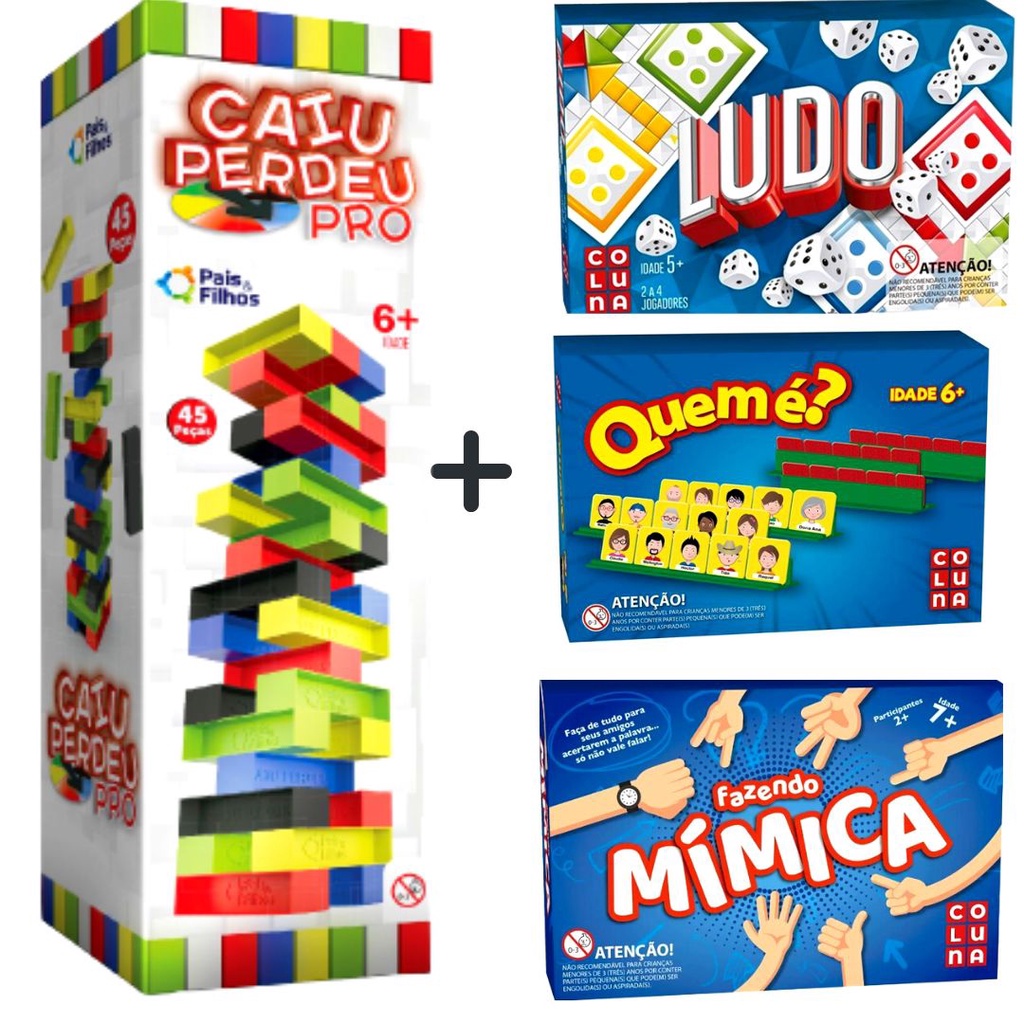 KIT 4 JOGOS - Jogo Caiu Perdeu PRO 45 Blocos Coloridos + Fazendo Mimica + Ludo + Quem é (Estilo cara a cara) - Promoção