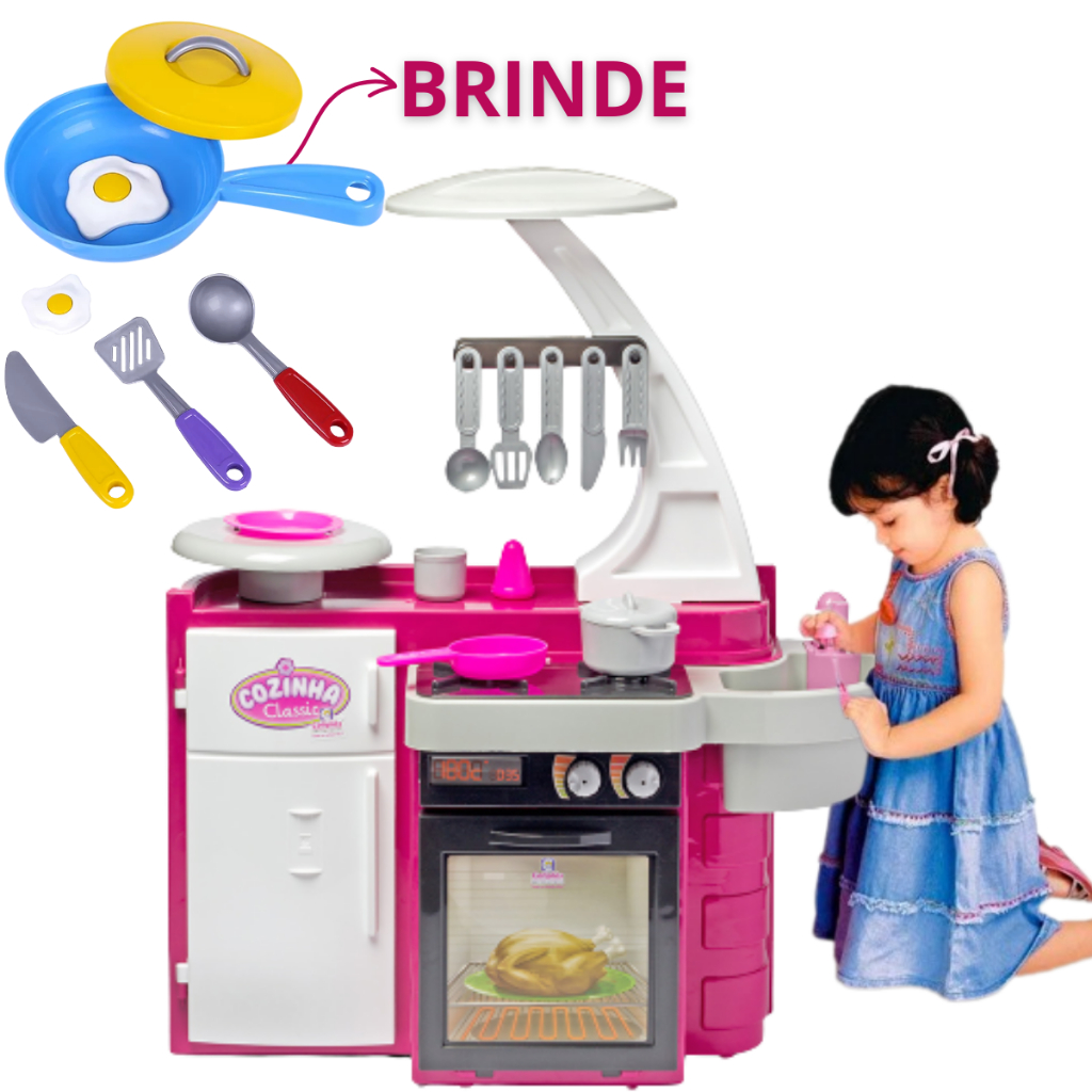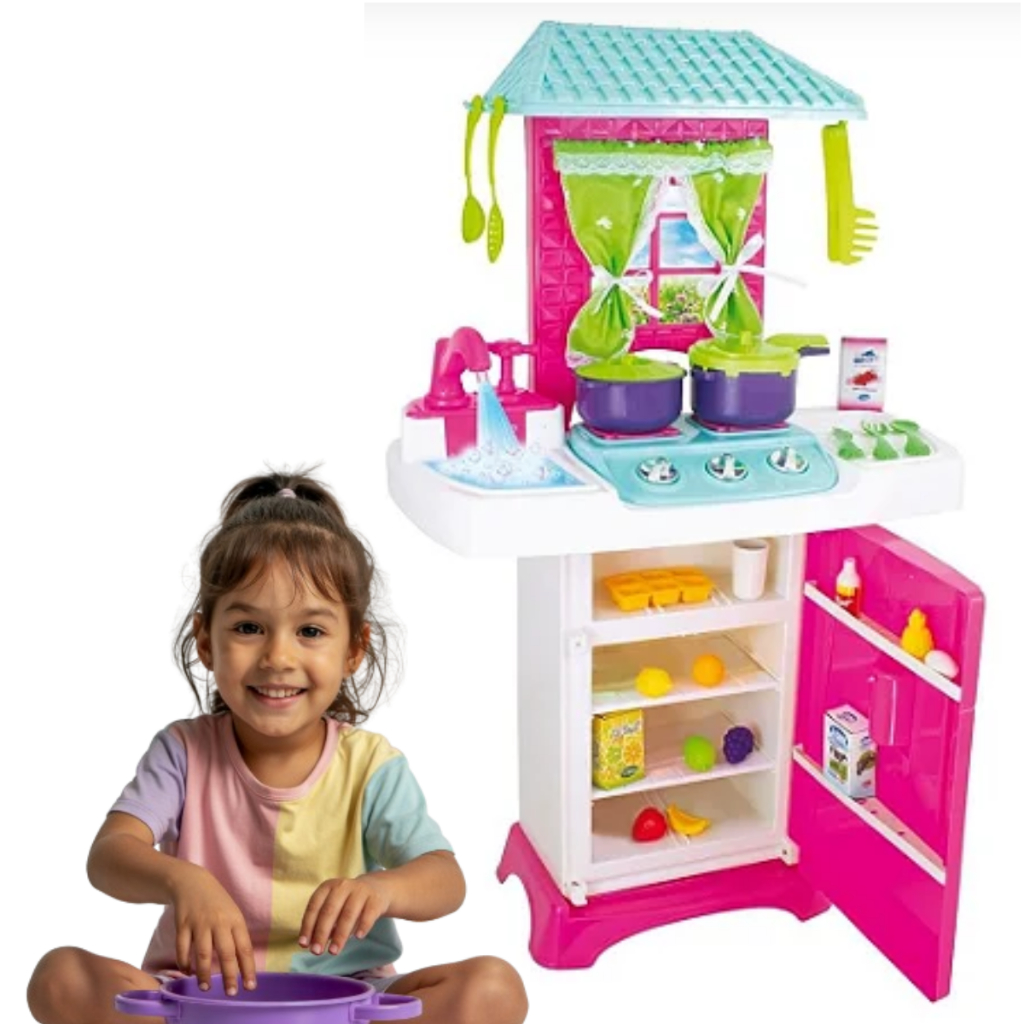 Cozinha Infantil Menina Completa Fogão Grande 74cm Com Geladeira Acessórios e Pia que sai Água