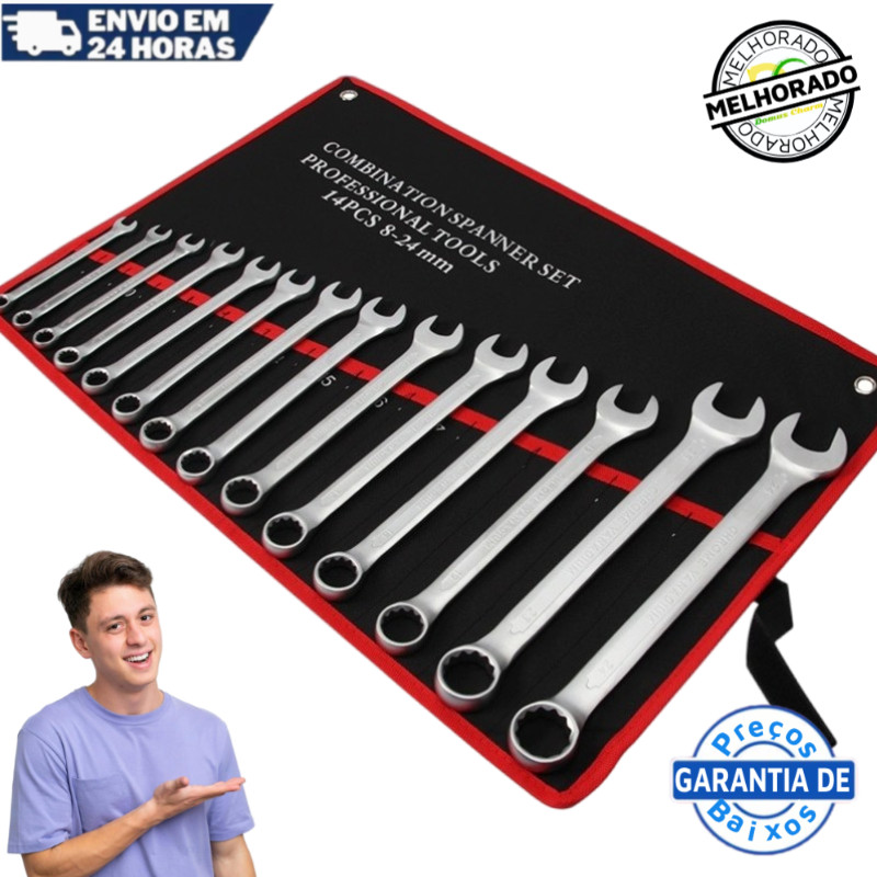 Kit Jogo De Chave Combinada 8 A 24 mm Boca Estrela Aço Cromo Profissional Maleta 14 Peças