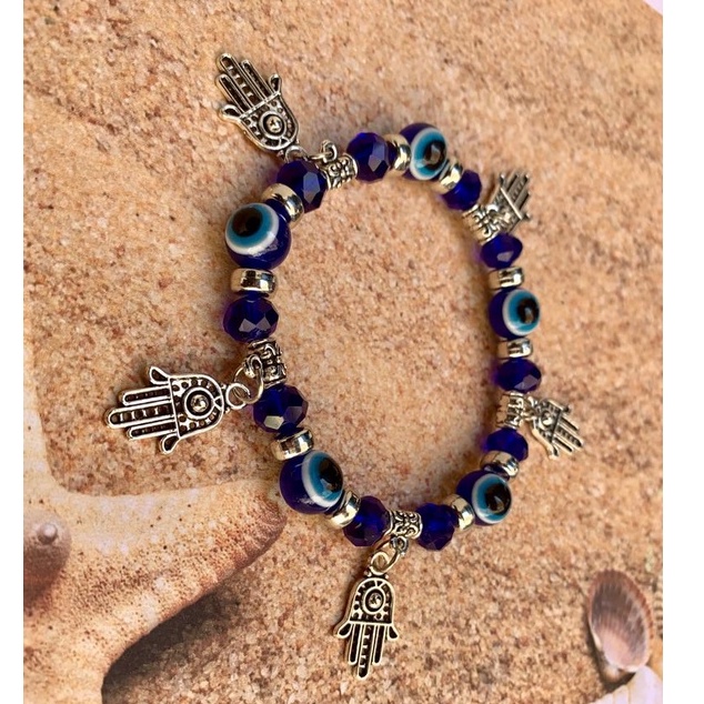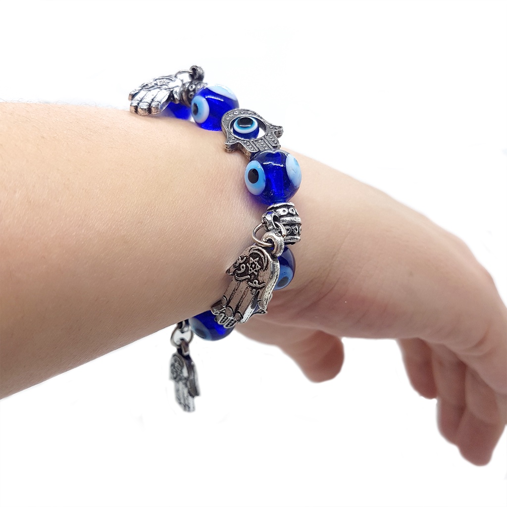 Pulseira Feminina Olho Grego e Mão de Fátima Mão Hamsá Azul