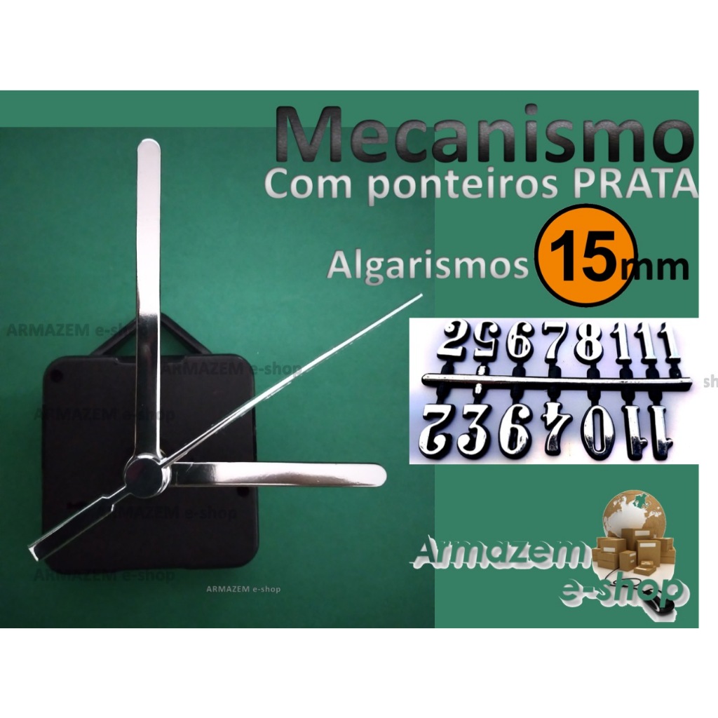 Kit Maquina de Relogios De Parede 22mm + Ponteiros palito tradicional prata E NUMEROS