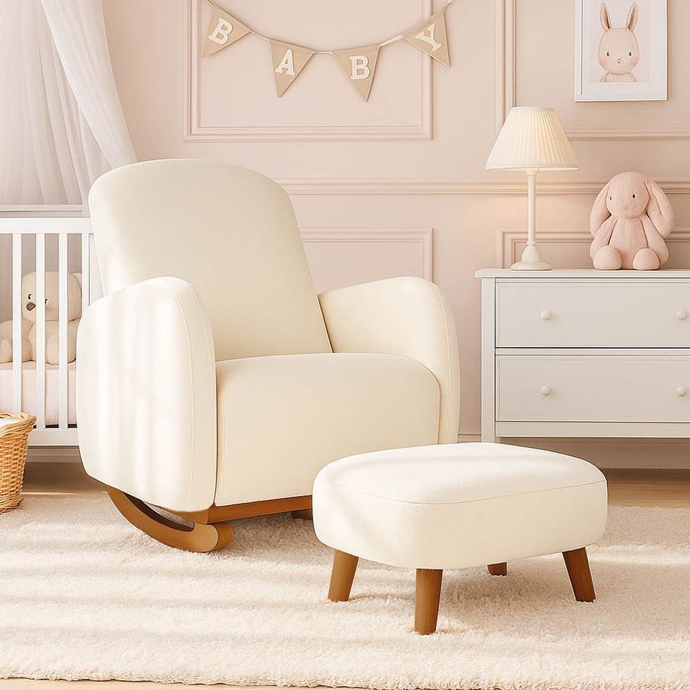 Poltrona Amamentação Balanço Madeira e Puff Jhessy Bouclê Bege R04 - D’Rossi