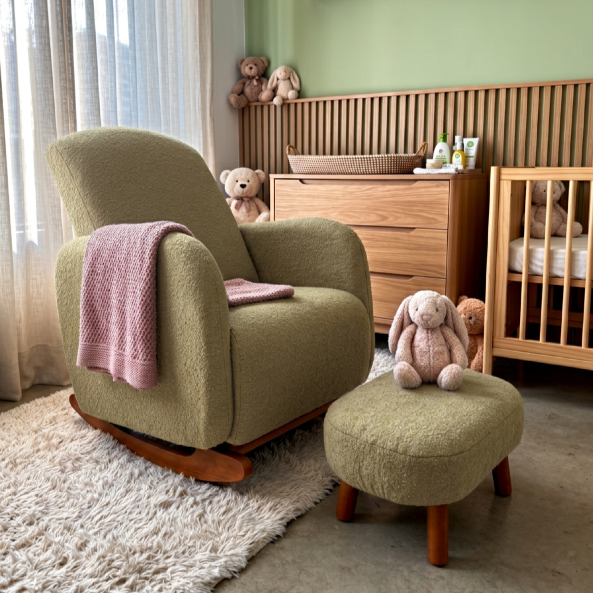 Poltrona Amamentação Balanço Madeira e Puff Jhessy Bouclê Pistache R04 - D’Rossi