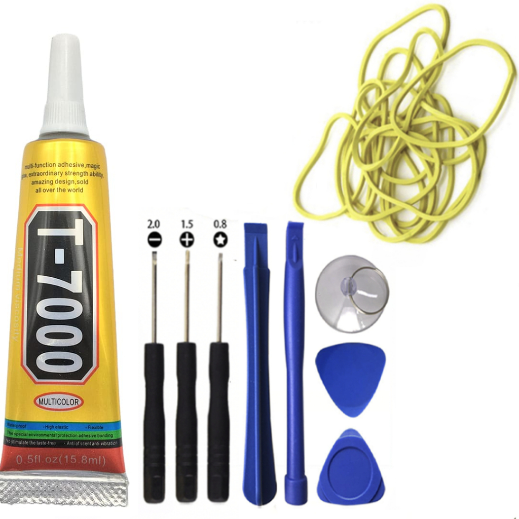 KIT COLA T7000 15ML + FERRAMENTAS + ELÁSTICOS REPAROS TROCA TELA TAMPA CELULARES