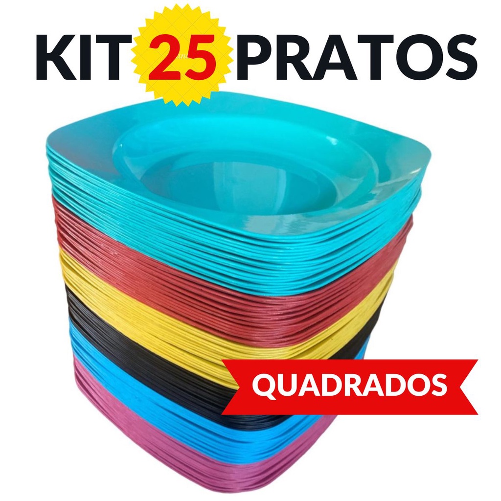 kit 25 pratos quadrados de plástico coloridos rosa azul preto amarelo vermelho verde festa escola refeitório creche berçário escolinha hospital acampamento igreja asilo idoso orfanato servir refeição sobremesa festa cantina churrasco porções cozinha