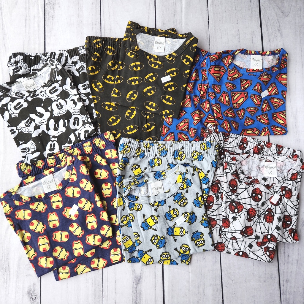 Kit 4 peças pijama infantil menino manga curta verão 2 camisetas + 2 bermuda heróis mickey minions