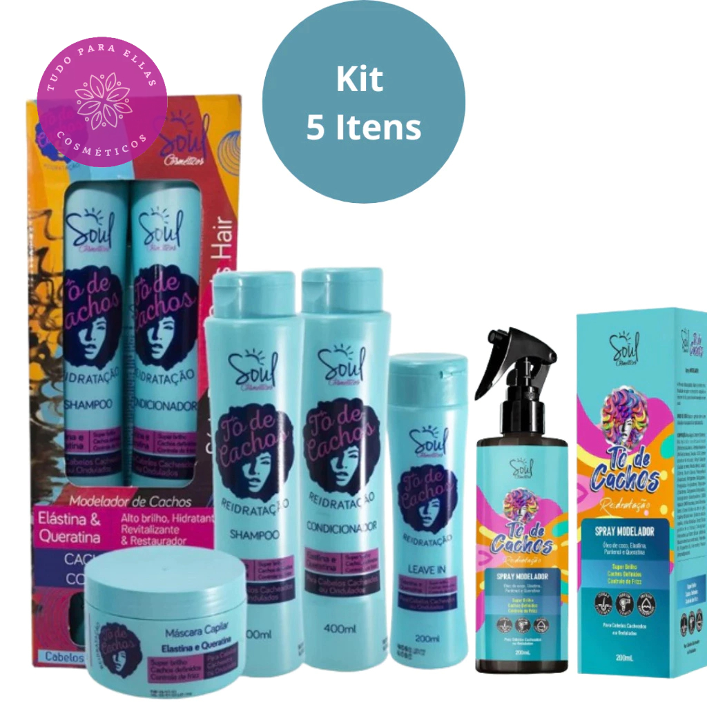 Kit Capilar Tô de Cachos Shampoo Condicionador Máscara de Hidratação Leave In e Spray finalizador Modelador Soul Cosméticos 380ml