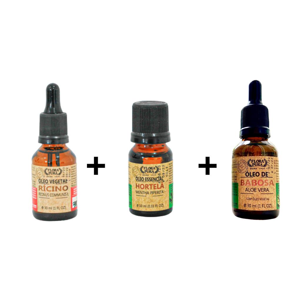 Kit 3 Óleos - Óleo Vegetal de Rícino + Óleo Essencial de Hortelã + Óleo Vegetal de Babosa - Flora Pura (SHOPNATIVA)