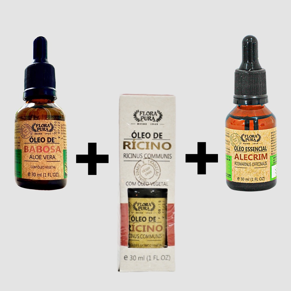 Kit 3 Óleos - Óleo Essencial de Alecrim + Óleo Vegetal de Babosa + Óleo Vegetal de Rícino - Flora Pura (SHOPNATIVA)
