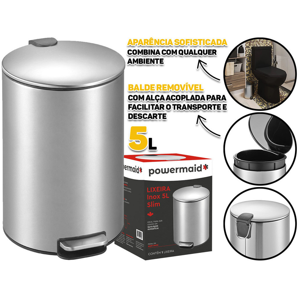 Lixo Lixeira Slim 5 Litros Aço Inox Balde Cesto Removível Com Alça Pedal Para Banheiro Escritório Lavabo Cozinha Fraldas Bebe Casa Restaurantes Pet Powermaid