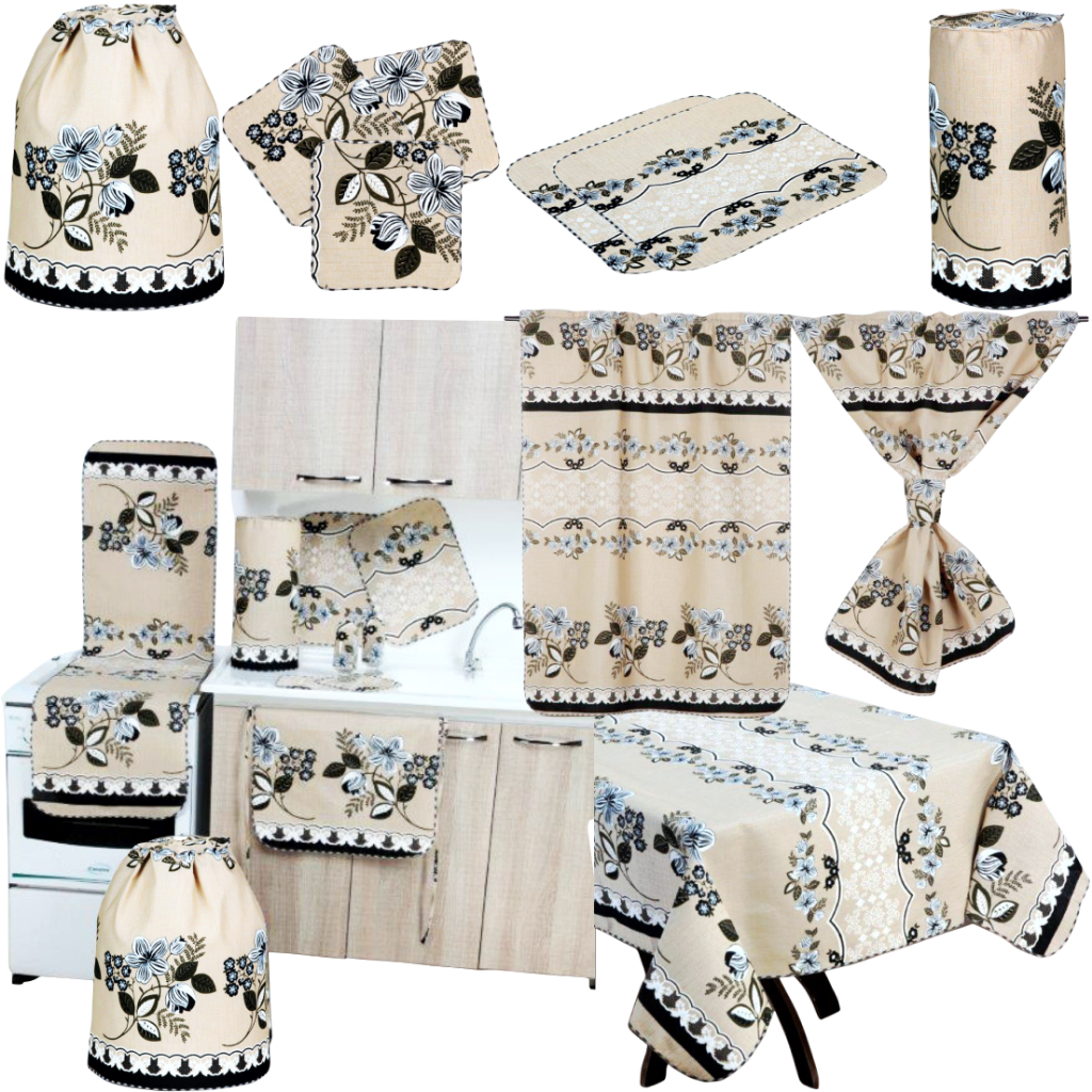 Jogo de Cozinha Bordado e Estampado 14 Peças Kit Com Cortina Vitrô e Toalha de Mesa