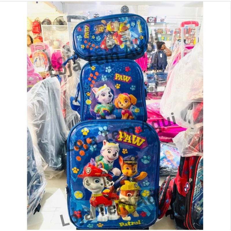 (Kit c/ 3 pecas) Mochila Rodinha+Estojo+Lancheira Infantil Patrulha Capitao Pequena Sereia Lool Homem Aranha Masha Escolar Rodinha Mc Frozen Moana Batman Sonic Naruto Mine Craft