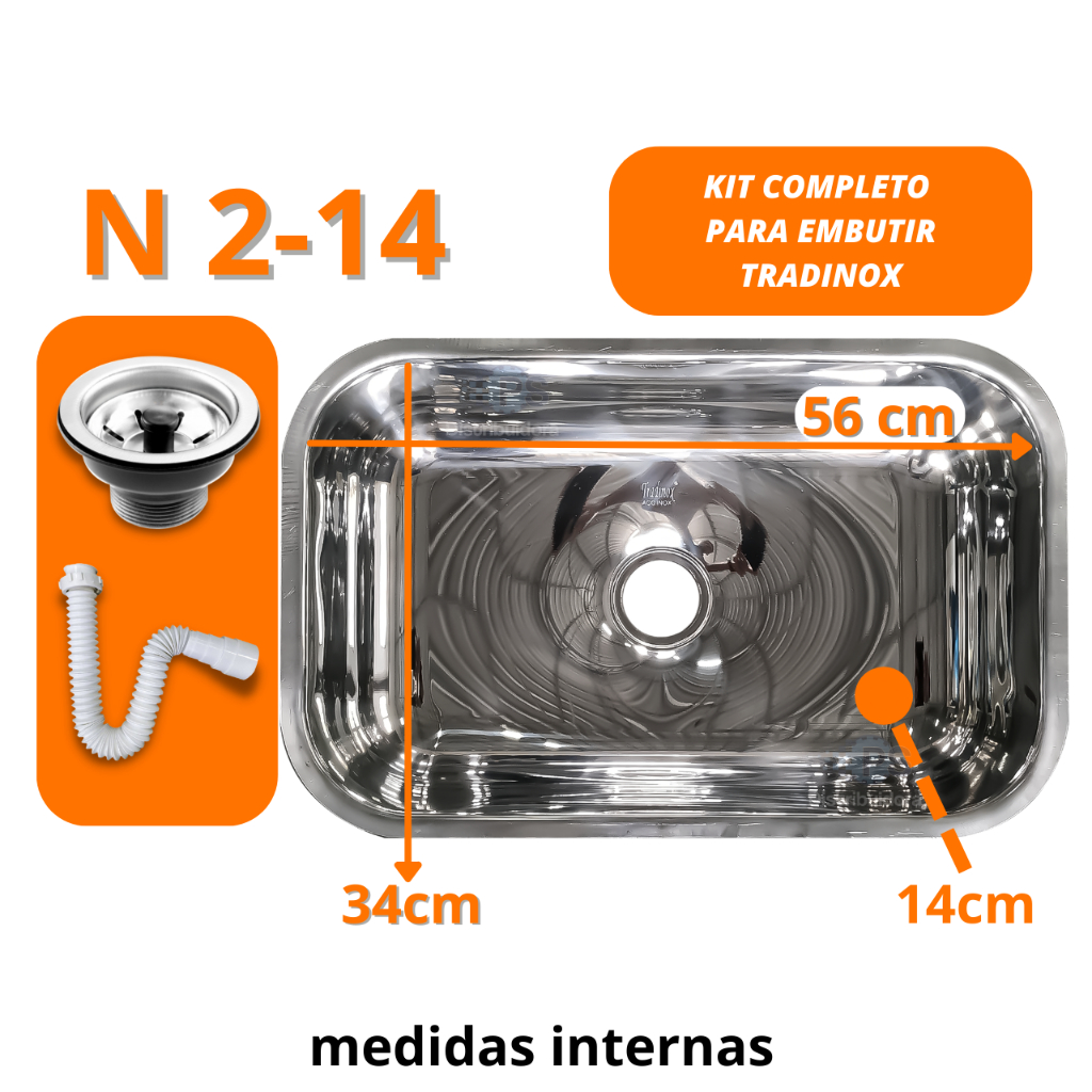 Cuba de Aço Inox Tradinox N 2 -14 56x34x14 Aço 430 Pia Cozinha embutir Polida com Válvula e Sifão