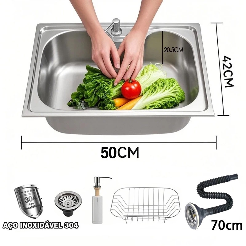 304 Cuba Cozinha Gourmet Pia Aço Inox Acessórios e tubo de descarga Embutir 50/60 x40 x 21 cm