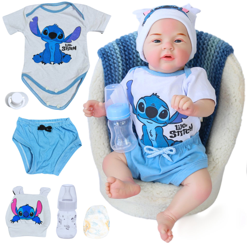 Bebê Reborn Menino Boneco Original Realista de Silicone Pode Dar Banho Roupa Stitch