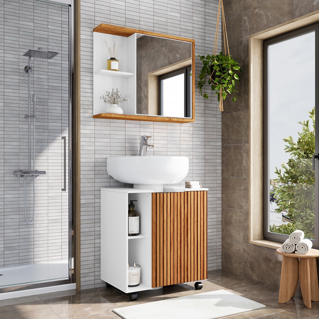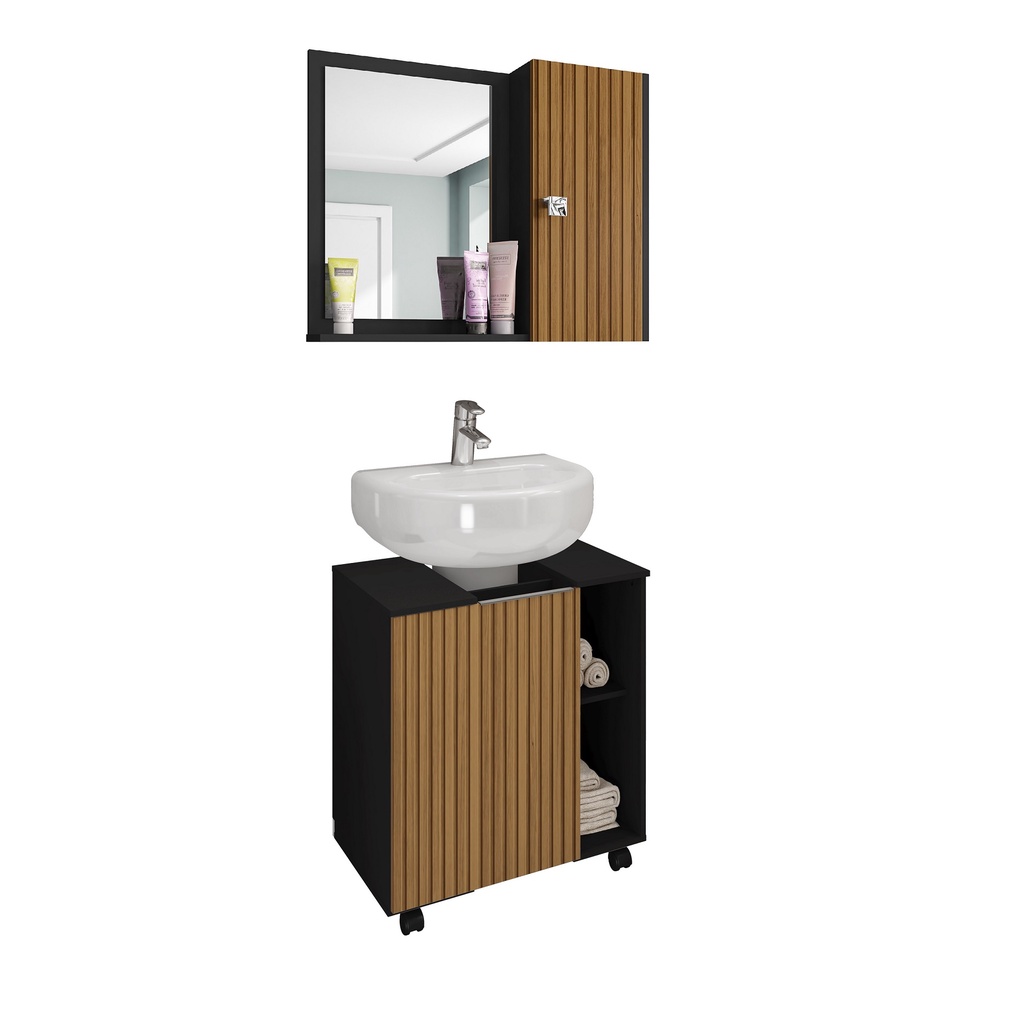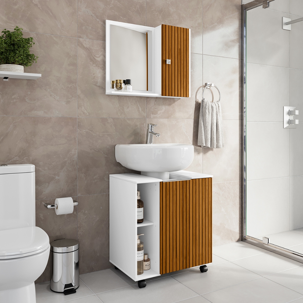 Kit Banheiro Gabinete 56cm Pia e Armário Com Espelho Munique Branco/Ripado - Bechara