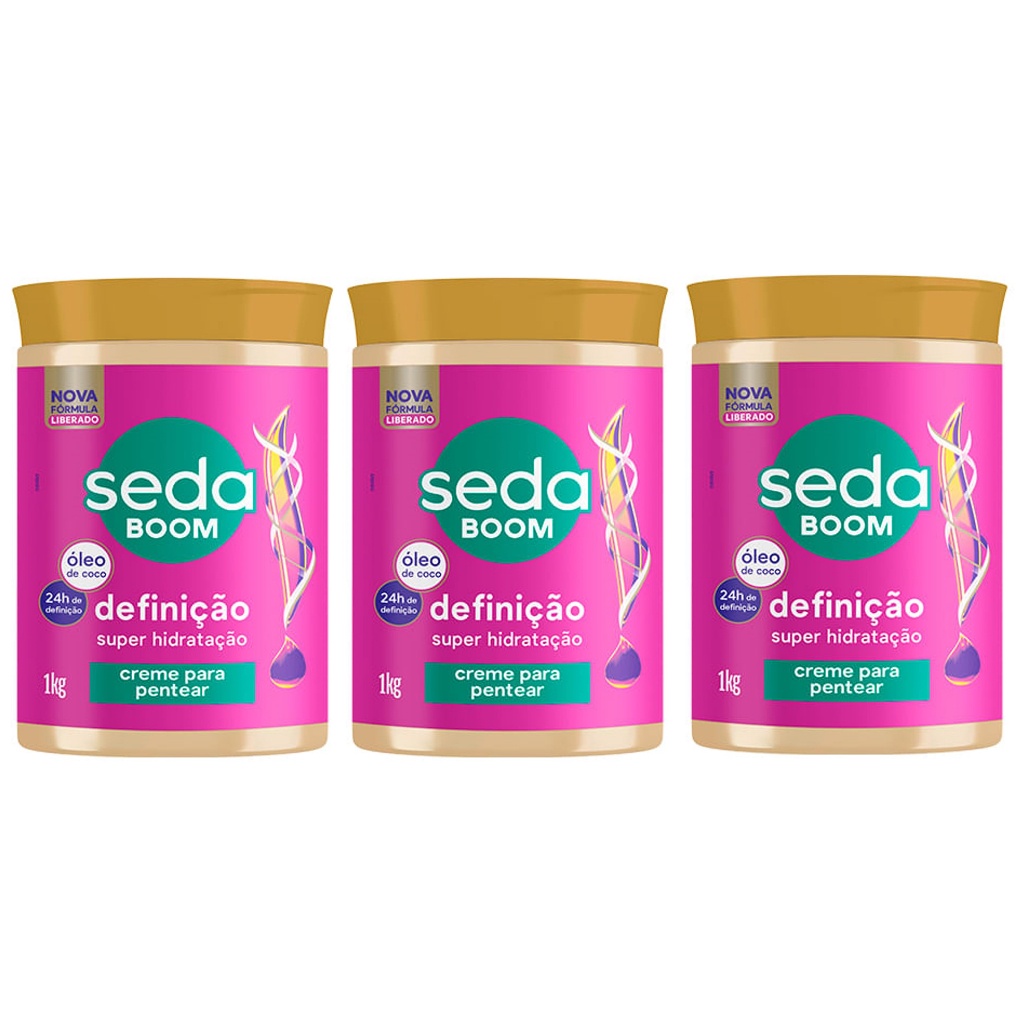 Kit com 03un Creme de Pentear Cachos Crespos Boom Definição Seda Blogueiras 1Kg Óleo de Coco