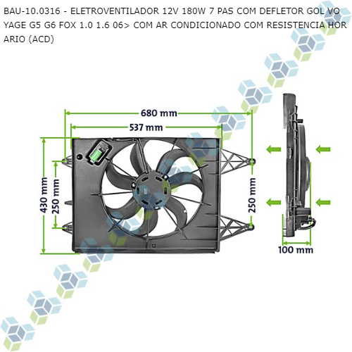 ELETROVENTILADOR 12V 180W 7 PAS COM DEFLETOR GOL VOYAGE G5 G6 FOX 1.0 1.6 06> COM AR CONDICIONADO COM RESISTENCIA HORARIO (ACD)
