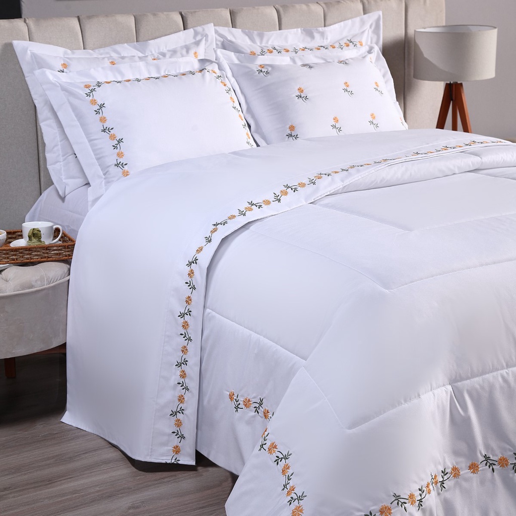 Kit Edredom Casal Queen Size 100% Algodão Bordado Tecido Percal 180 Fios 03 Peças Margarida