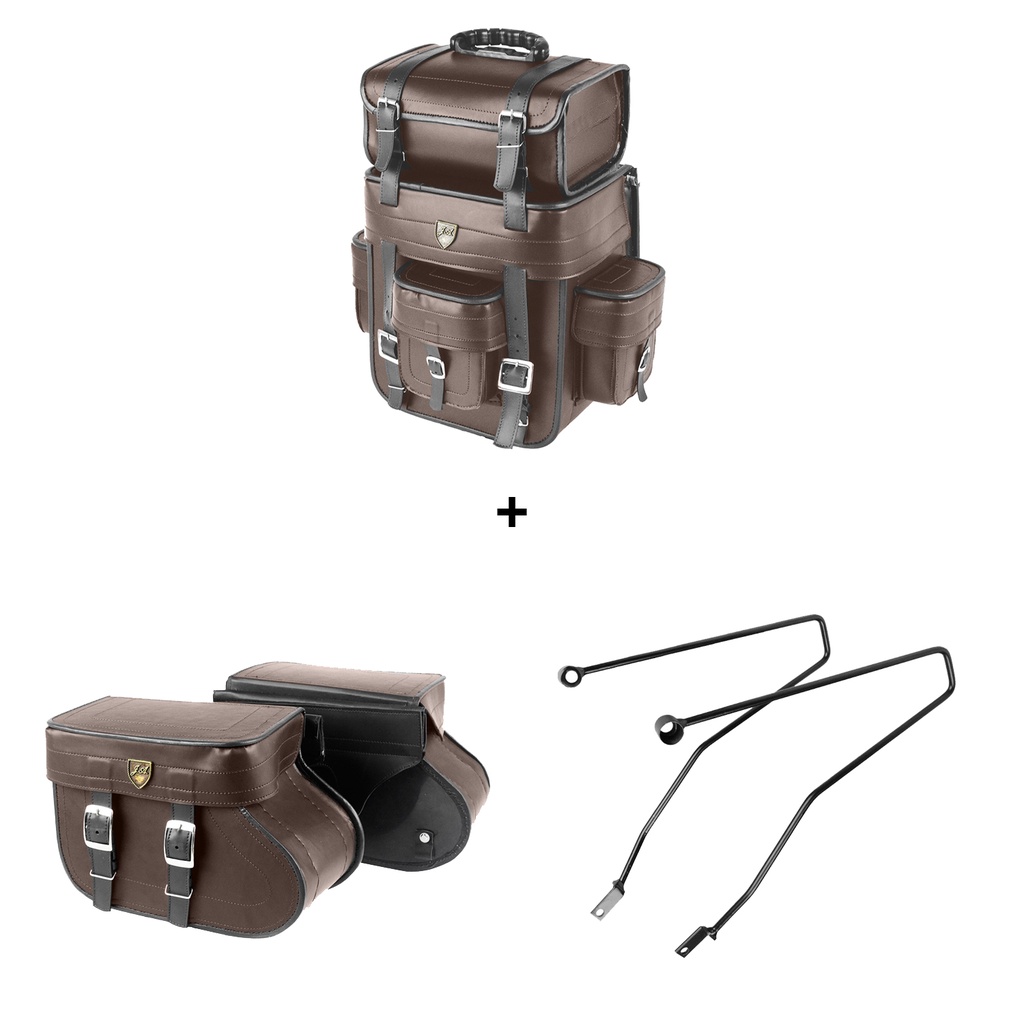 Kit Viagem Royal Enfield Meteor 350 Afastador + Alforge Lateral Botinha 18 Litros Sintético Marrom + Alforge Traseiro 32 Litros SIntético Marrom