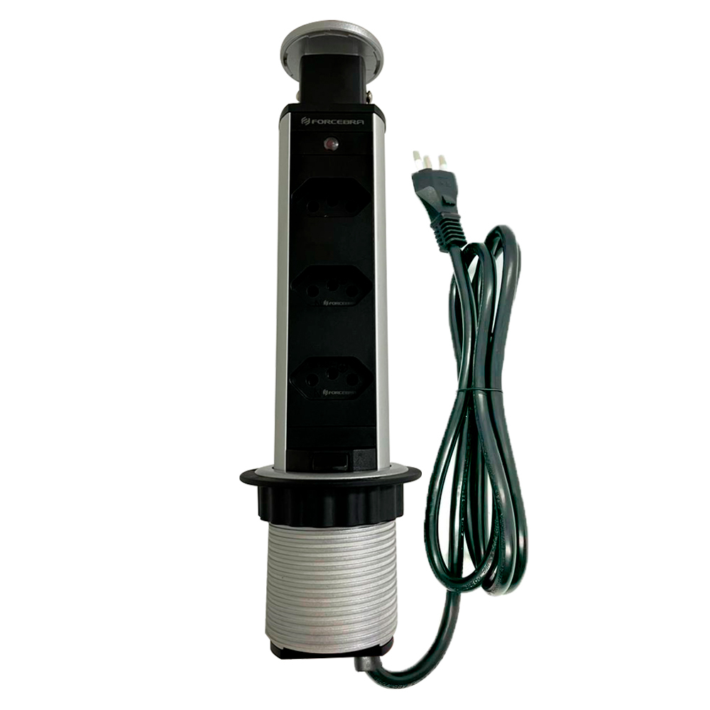 Torre De Tomada Multiplug Retrátil 3500W prata Bivolt com 3 tomadas Inmetro Embutir Mesa bancada