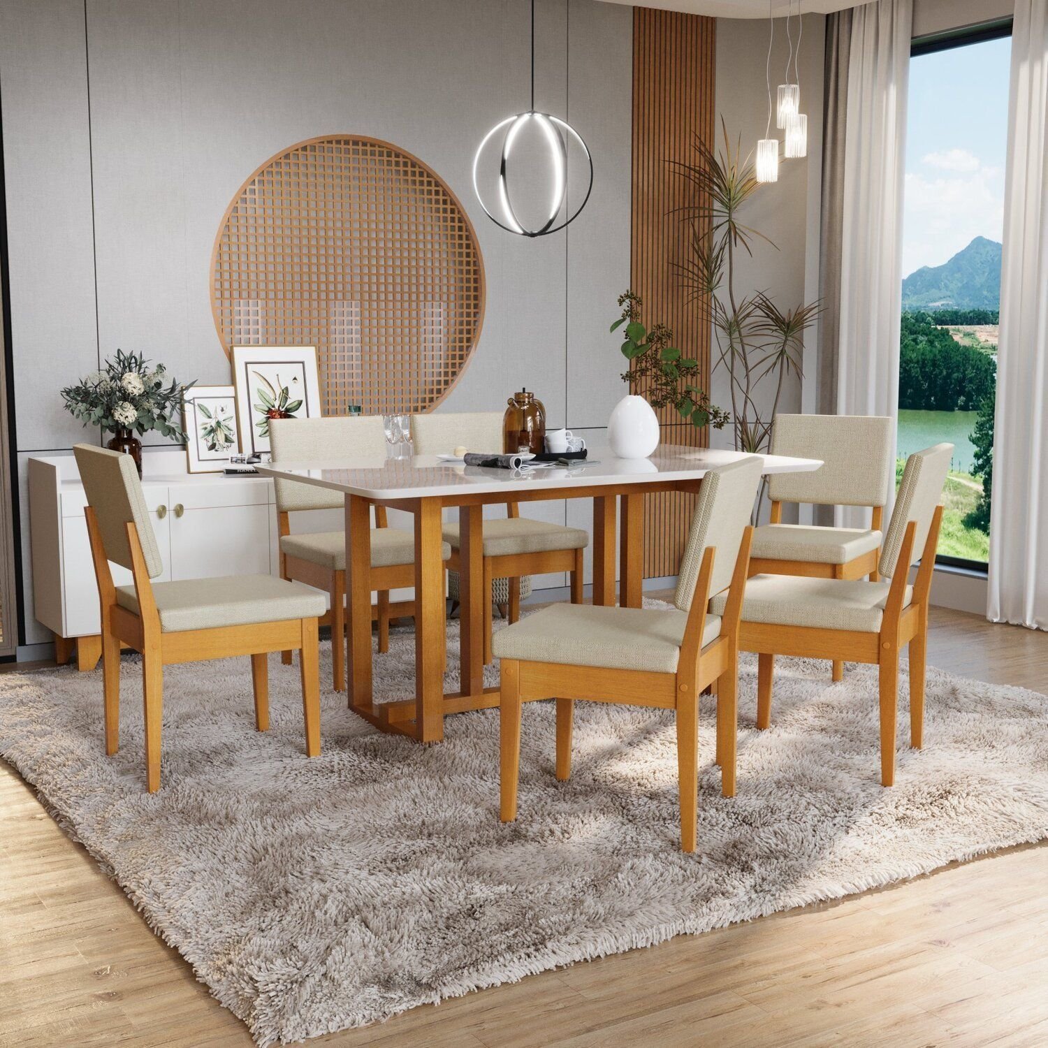 Conjunto de Mesa Sala de Jantar Miami com 6 Cadeiras Trieste Suede 1,60m Cedro / Off White / Mascavo Dobuê