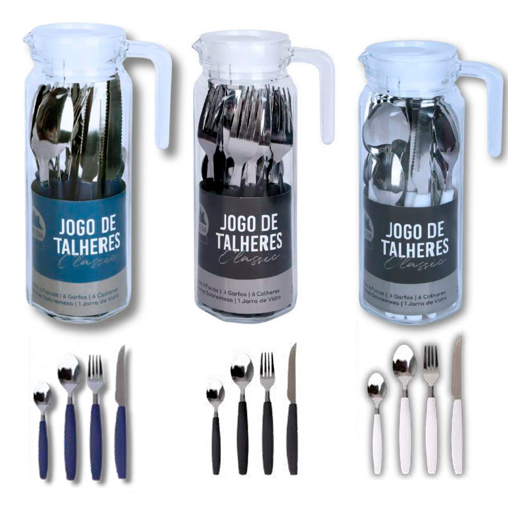 Conjunto de Talheres Faqueiro Aço Inox 24 Peças com Jarra de Vidro Preto ou Vermelho